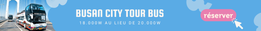 Le bus touristique de Busan est un autre moyen de vous déplacer à travers la ville et vous permet de découvrir tous les spots de la ville que j’ai cités juste au dessous et plus encore ! D’ailleurs avec un seul billet, vous pouvez emprunter 3 lignes (rouge, orange, verte) et descendre/monter aux arrêts que vous voulez pendant la journée ! Réservez votre billet à tarif réduit en cliquant sur l’image juste en dessous !