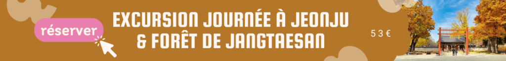| Adresse : 📍461 Jangan-ro, Seo-gu, Daejeon (대전광역시 서구 장안로 461) 🎟️ Excursion d’une journée à Jeonju et au mont Jangtaesan > dispo tous les jours en automne / 53€ (départ de Séoul) cliquez pour réserver facilement ! |