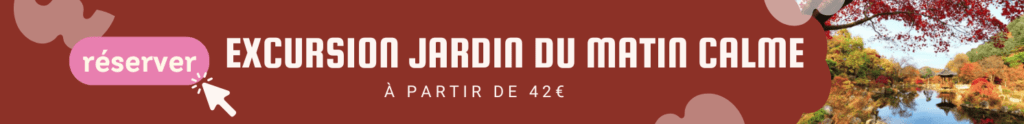 | Adresse : 📍432 Sumogwon-ro, Sang-myeon, Gapyeong-gun, Gyeonggi-do (경기도 가평군 상면 숨오권로 432) 🎟️ Excursion journée visite de l’île de Nami et Jardin du matin calme > dispo tous les jours du 01 oct. au 31 déc. / / 42€ (au départ de Séoul) cliquez pour réserver! |