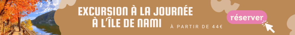 | Adresse : 📍1 Namiseom-gil, Chuncheon-si, Gangwon-do (강원도 춘천시 남이섬길 1 남이섬) 🎟️ Excursion journée visite de l’île de Nami et Jardin du matin calme > dispo tous les jours du 01 oct. au 31 déc. / 42€ (au départ de Séoul) cliquez pour réserver! |