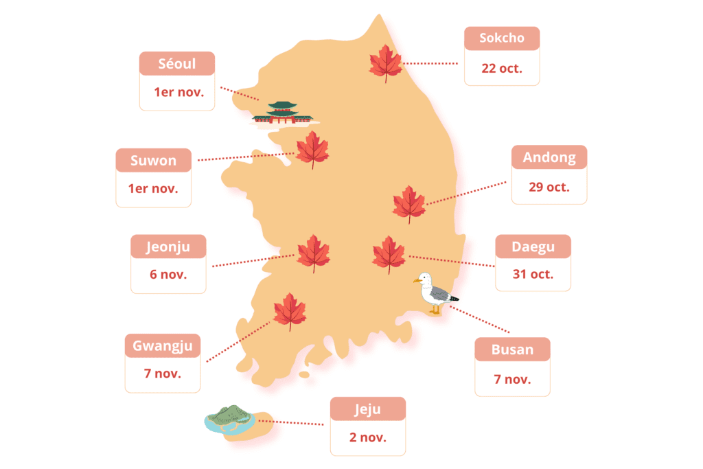 Le pic de ces changement de couleur est généralement diffusé sur le site de visitkorea ou sur les réseaux sociaux quelques semaines avant. Les prévisions pour 2025 :